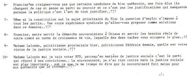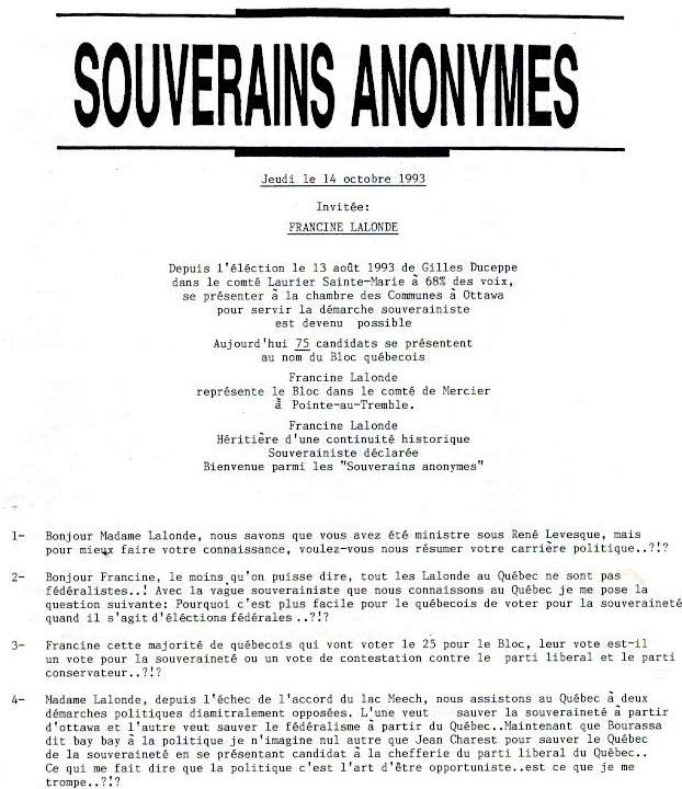 Francine Lalonde, alors députée du Bloc québécois n'a jamais pu se présenter à la rencontre.